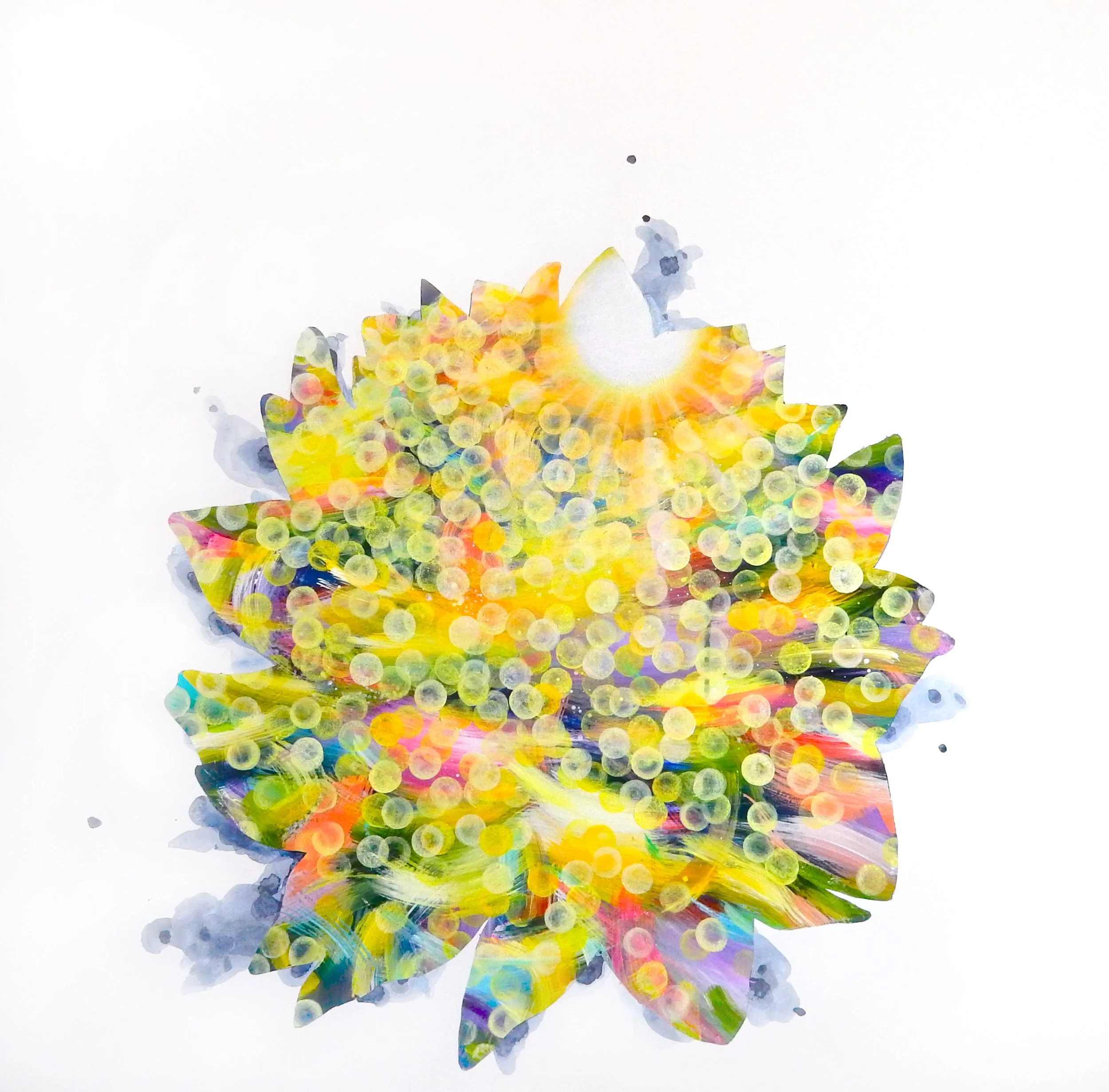Rich in yellows and greens, Bando’s work almost bursts with energy from what is otherwise stark white canvas. Light refracts in circular form atop a background created with long brushes of reds, blues and oranges.