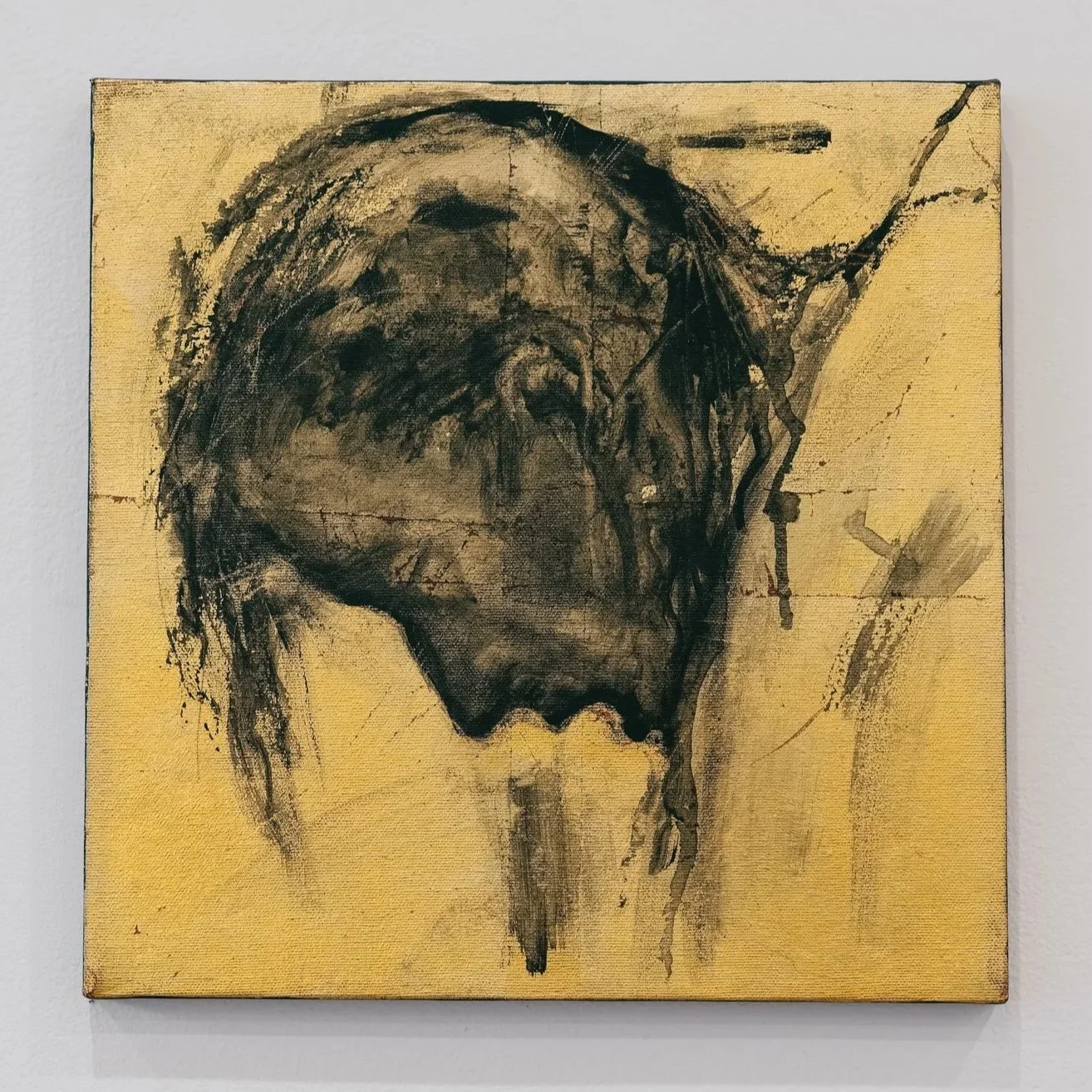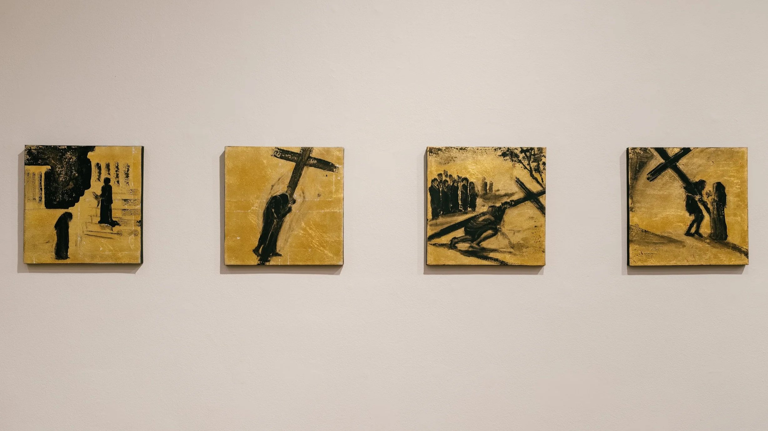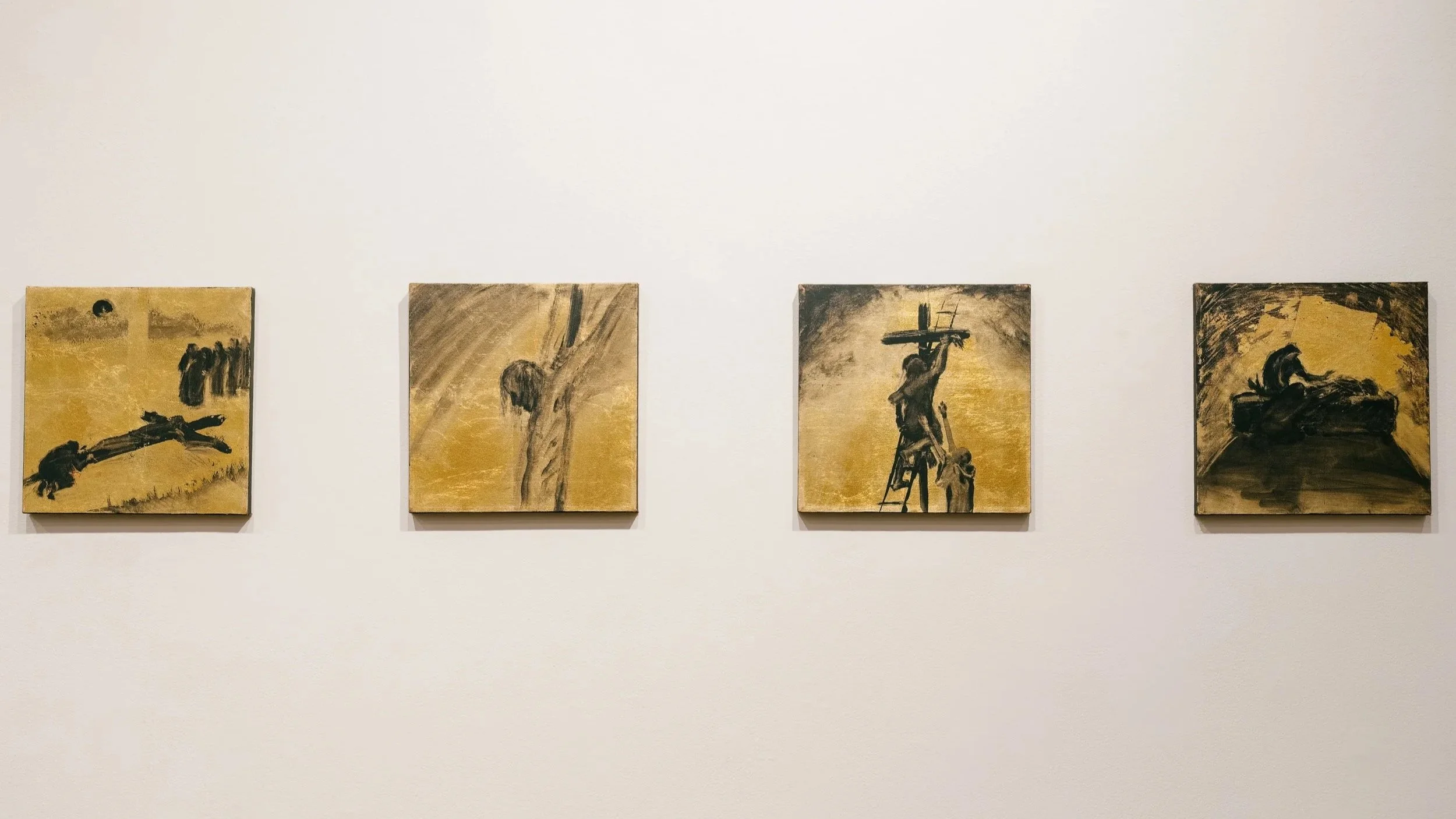 The material of the paintings echoes the narrative themes of humility and glory, as each holy scene is contained within a 12 inch square, with a gold-leafed canvas and simple, flat abstraction in black acrylic gesso. The gold-leaf brings the scenes alive with light, reflecting and changing throughout the viewer’s encounter with the artwork. Much of the detail and content suggested by the brushwork arose by chance—the series was an intuitive, spontaneous process, with the images flowing quickly and directly, without premeditation and without reference to sketches or photos.